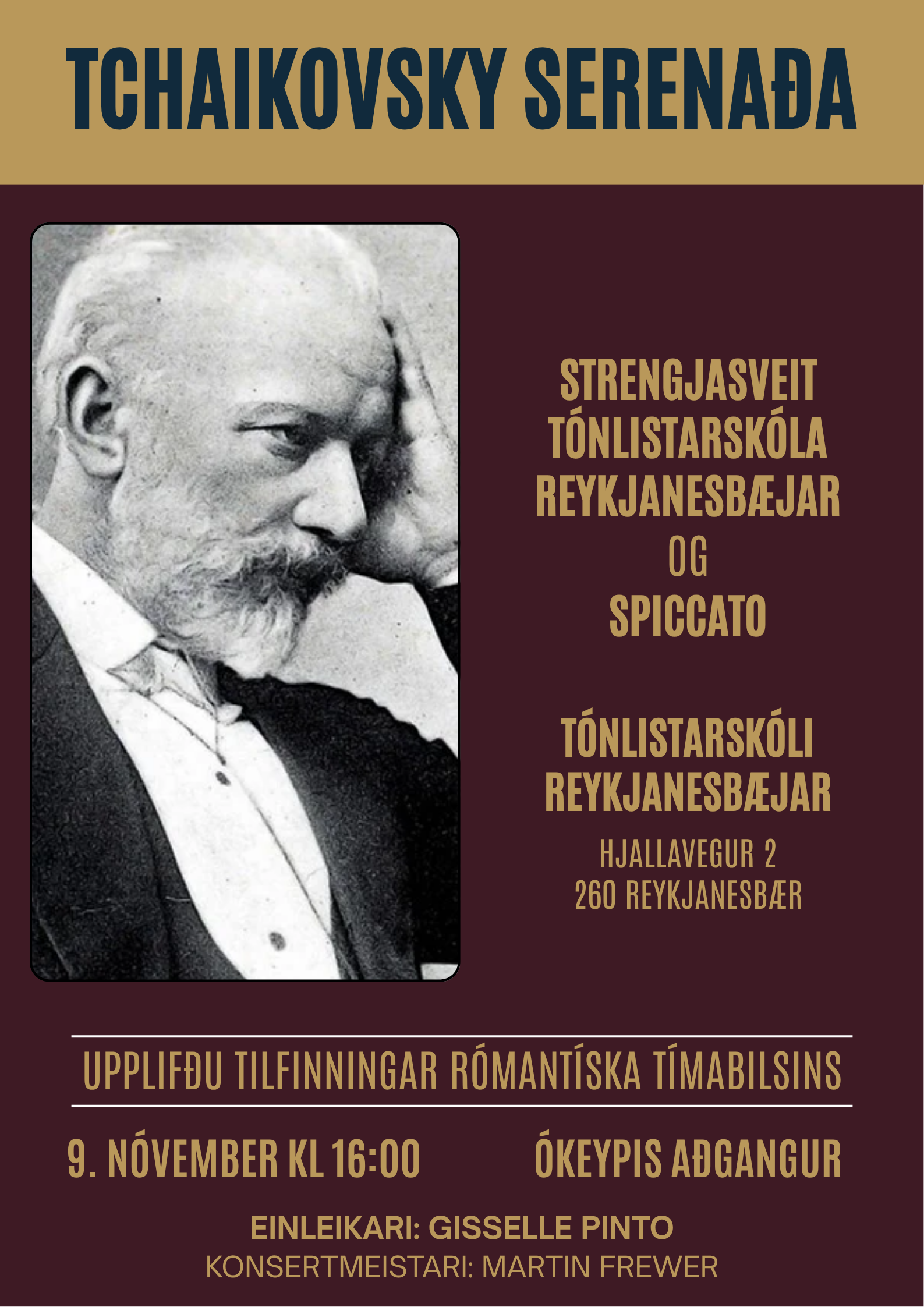 Sunnudaginn 9. nóvember kl. 16:00 mun Strengjasveitin Spiccato spila Tchaikovsky Serenöðu fyrir strengi ásamt nokkrum styttri verkum. Með á tónleikunum leikur eldri strengjasveit Tónlistarskóla Reykjanesbæjar og einnig mun Gisselle Pinto, fiðlunemandi við skólann leika eitt verk við undirleik Spiccato. Tónleikarnir eru í Bergi, sal Tónlistaskólans og eru tæpur klukkutími að lengd. Ókeypis aðgangur og allir velkomnir!